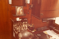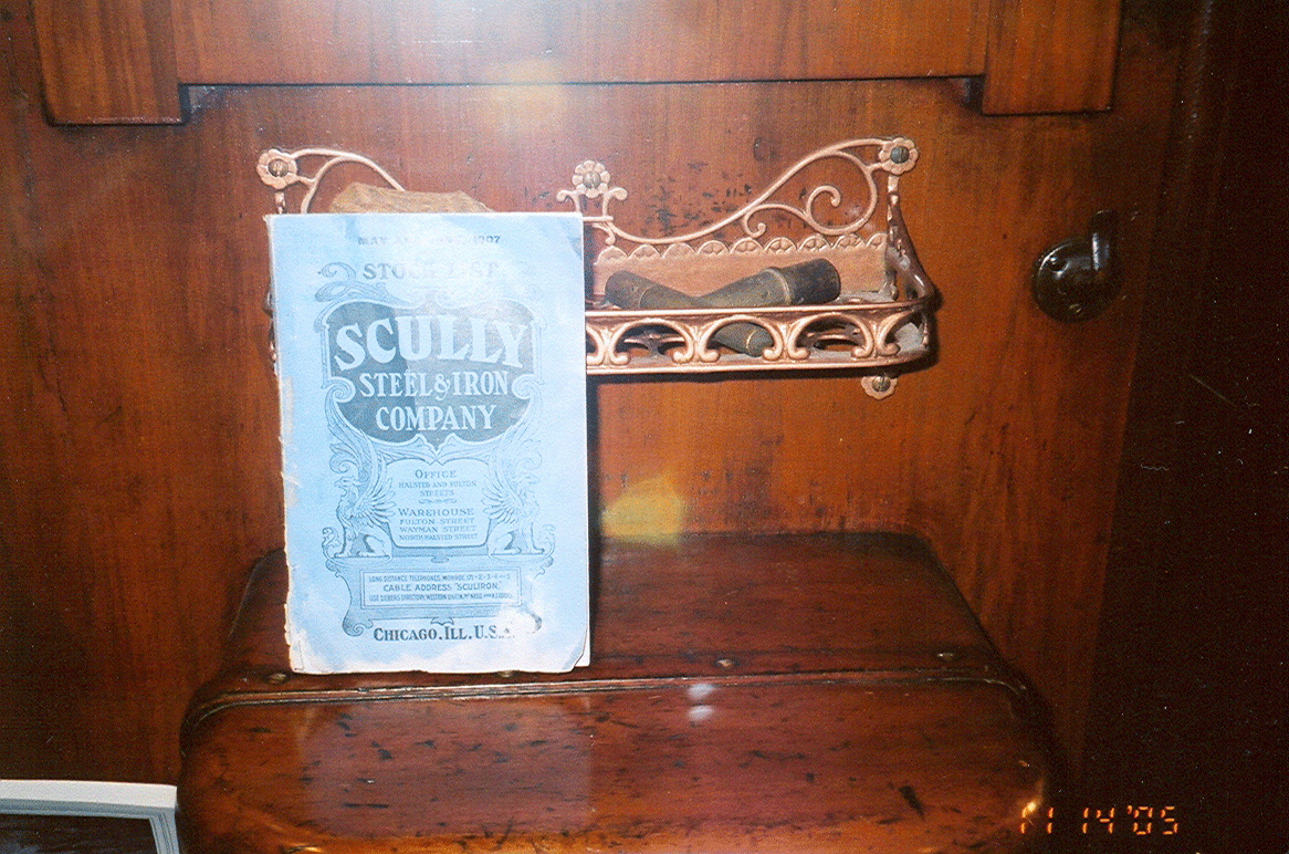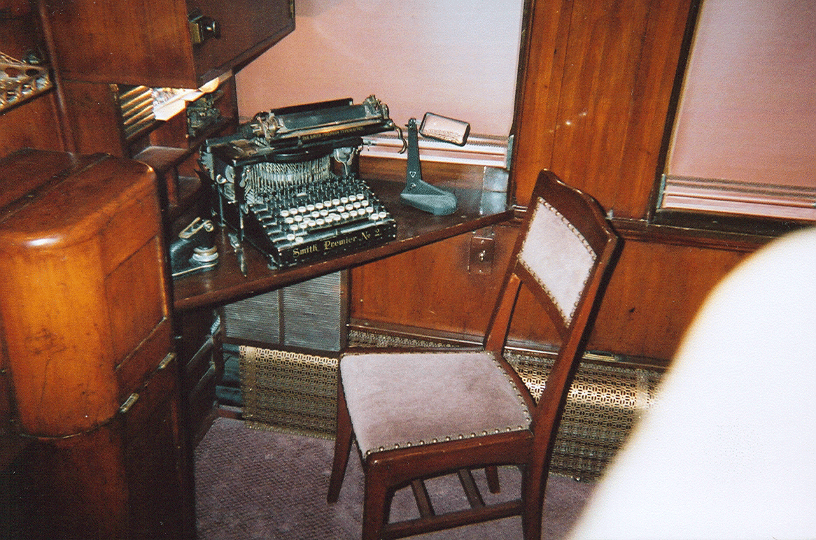This self-contained office and living quarters offered a bit of civilization in the rocky mountain wilderness. Railroad executives were normally accompanied by a male secretary to perform administrative duties. This room was the secretaries office, library and personal living quarters. Containing a wardrobe, fold down Murphy bed and sink, the room also served as a full office including the new automatic typewriter and of course, the telegraph. |