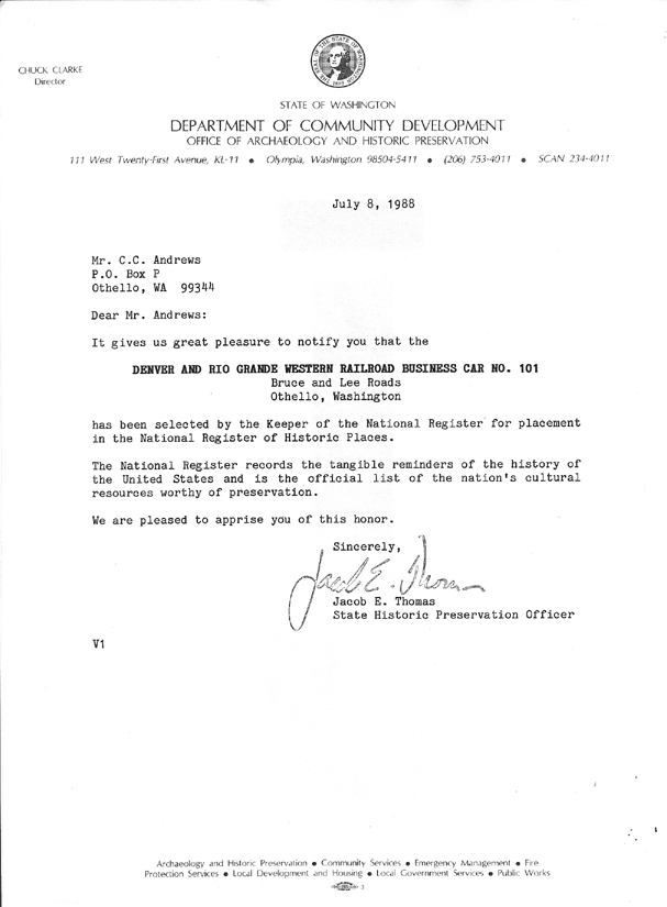 On July 8, 1988, Curtis Andrews received notification from Jacob Thomas, the Washington State Historic Preservation Officer, that the Denver and Rio Grande Western Railroad Business Car No. 101 has been selected by the Keeper of the National Register for placement in the National Register of Historic Places.